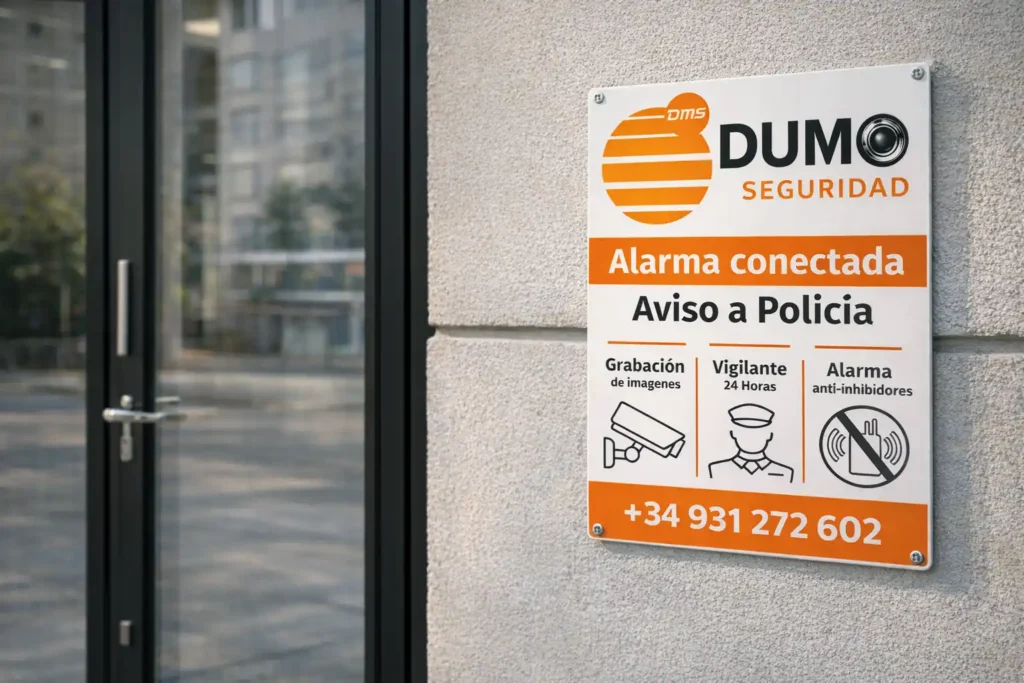 Colocamos señalización homologada instalada en los accesos y escaparate. Informa de que el local dispone de una alarma activa y conectada, lo que actúa como primera barrera de disuasión antes de cualquier intento de acceso no autorizado.